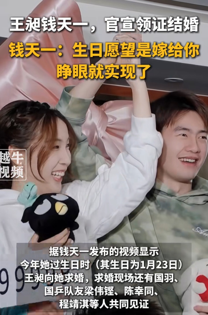 就在刚刚,2026年2月7日的中午13:14分,乒羽两大颜值担当钱天一与国羽的王昶甜美领证了,两人堪称金童玉女,完成一段佳话!球迷在给两位新人祝福的同时,也在为国乒的另外一对情侣惋惜!